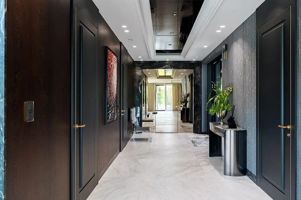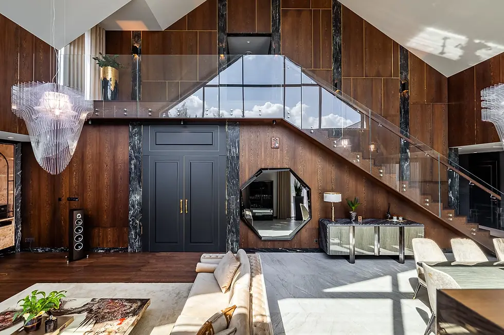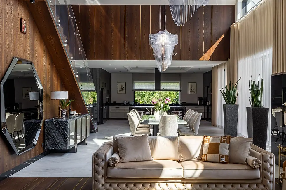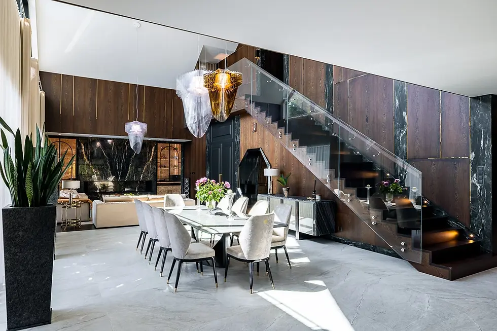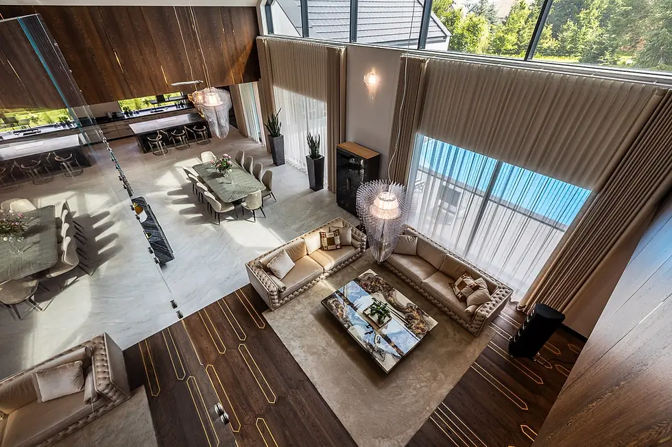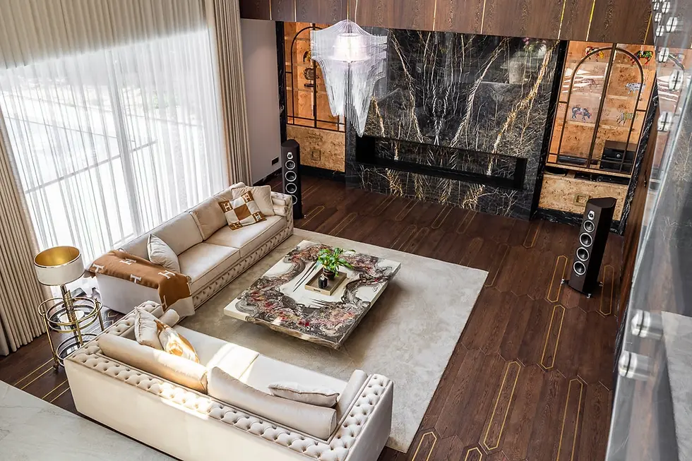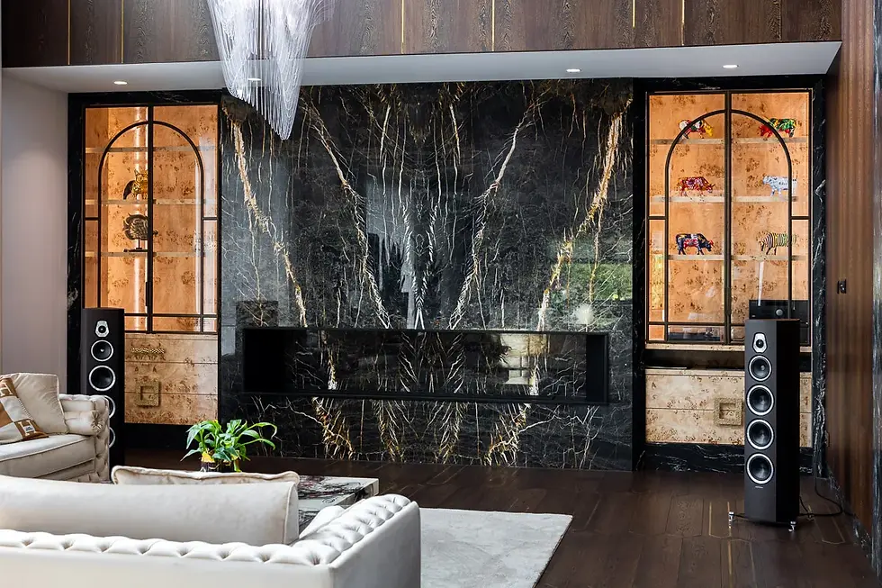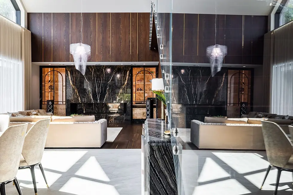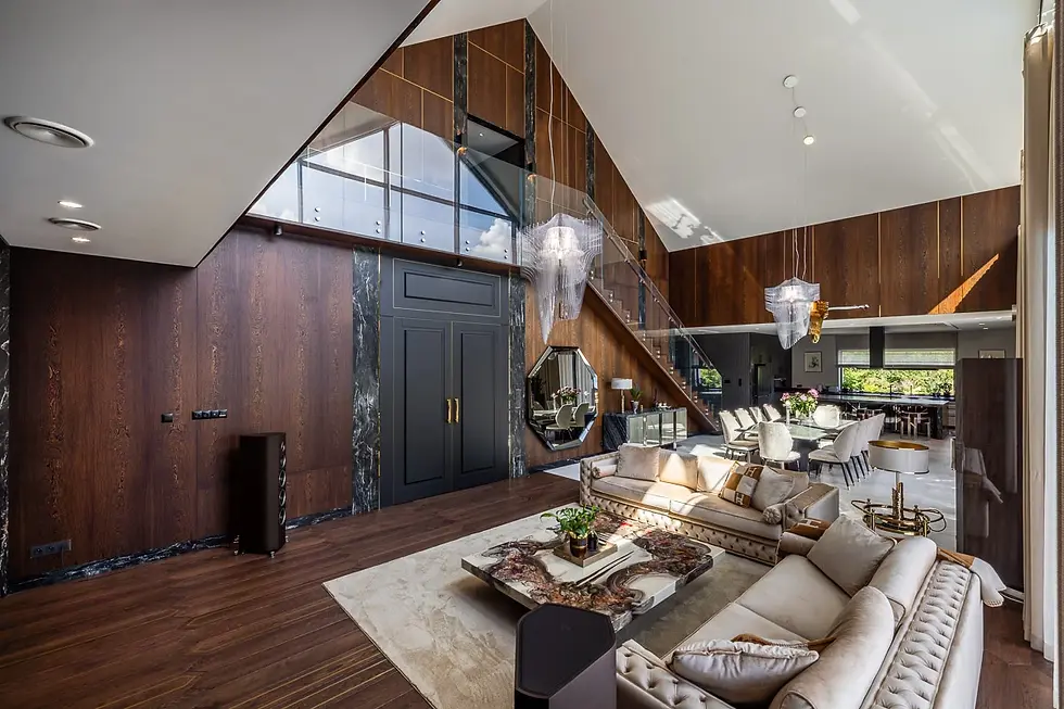 Sala kinowa jest w samym środku domu. Z jednej strony połączona z salonem z drugiej widok na kolekcję aut.